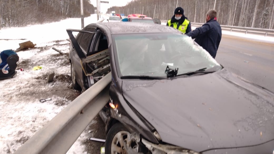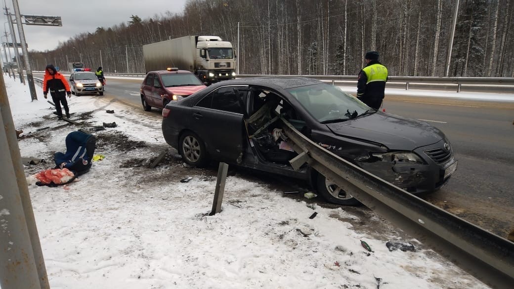 По предварительной информации, водитель легковой Toyota перестраивался в правую полосу, не справился с управлением и въехал в ГАЗель. От удара иномарку вынесло к отбойнику: машина влетела в ограждение, которое проткнуло ее насквозь.