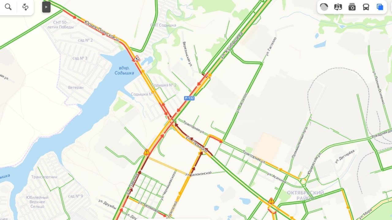 На въезде в город пробка начинается от поворота с Богослово, а на выезде за сотни метров до перекрестка Горького и Куйбышева.