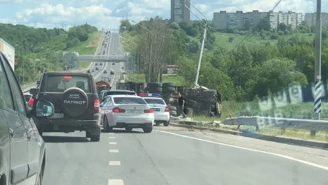 На Пекинке у Тандема перевернулся самосвал утром в пятницу, 17 июня. Очевидцы сняли видео и выложили в Сети.