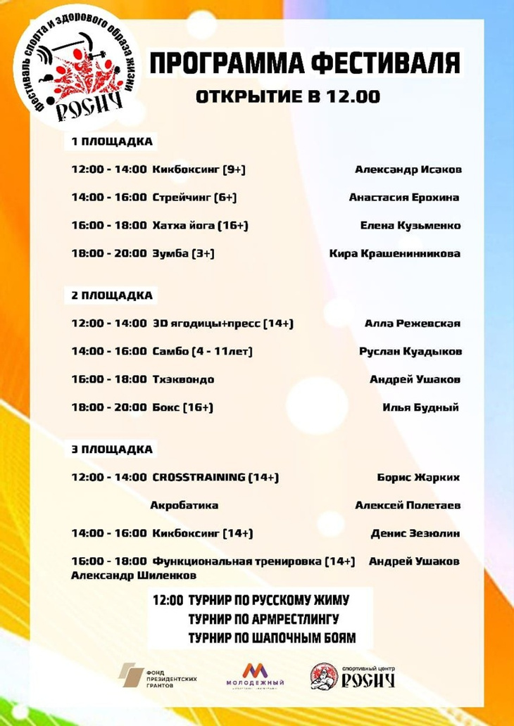 В парке будут работать три площадки, на которых пройдут мастер классы для взрослых и детей. В программе: кикбоксинг, акробатика, стрейчинг, йога, зумба, самбо и многое другое.