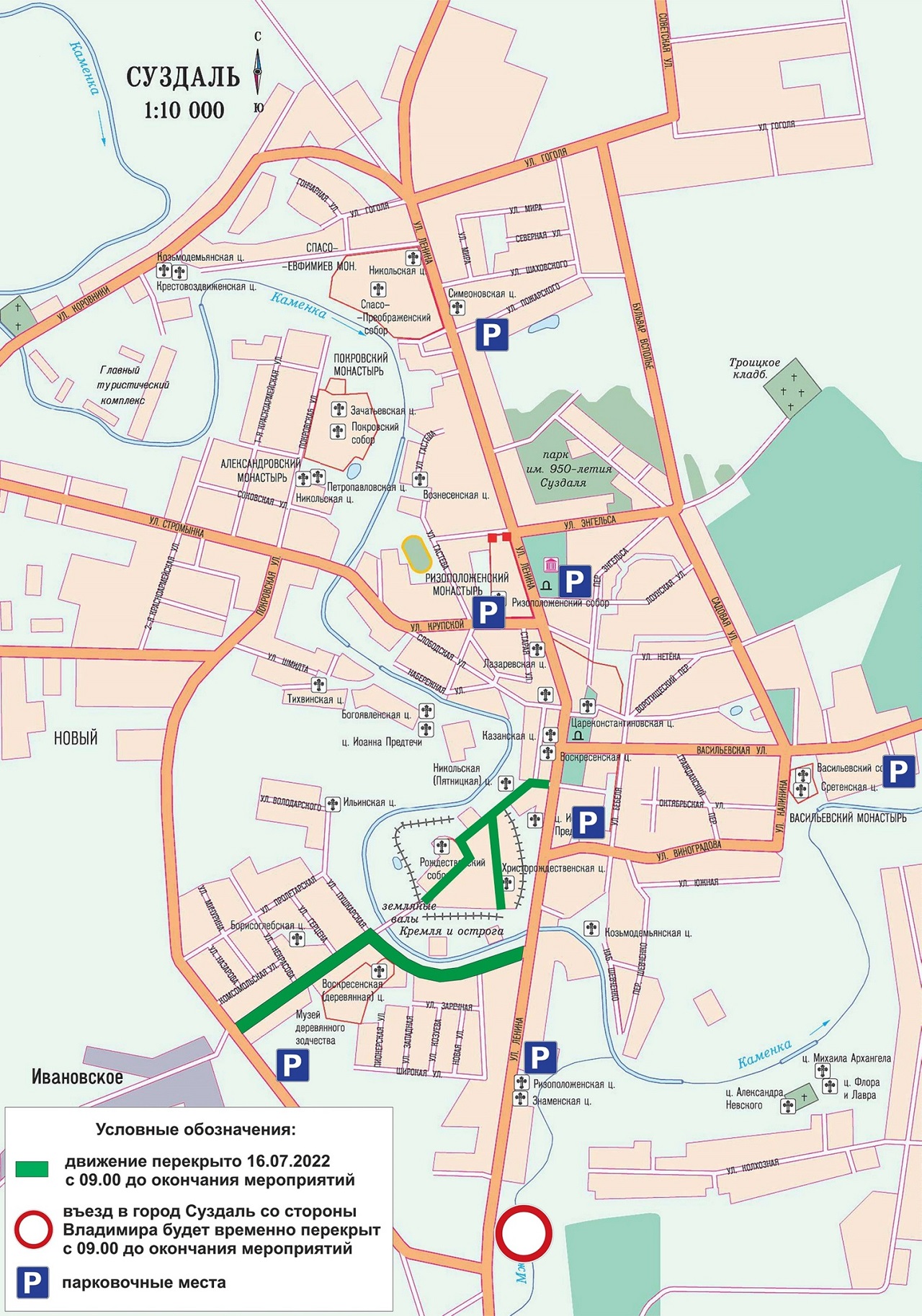 Запрет на движение транспорта наложили на въезд в Суздаль со стороны Владимира и движение по центру. В списке улицы Пушкарская, Толстого, Кремлевская, Лебедева, Варганова.