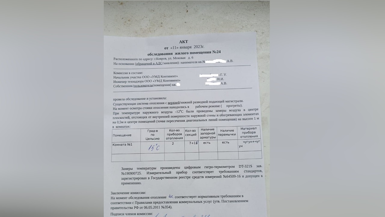 В итоге температура в комнате не поднимается выше 15 градусов. Несоответствие температуры нормам подтвердила и комиссия, которую пригласил Александр для обследования.