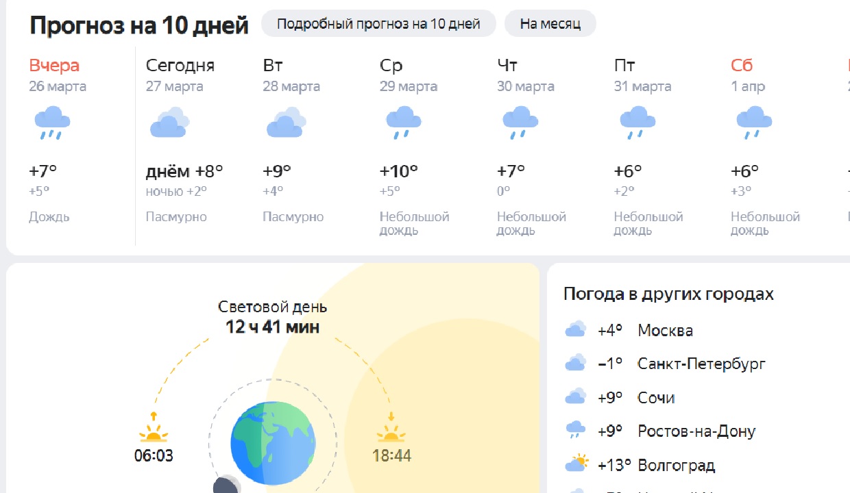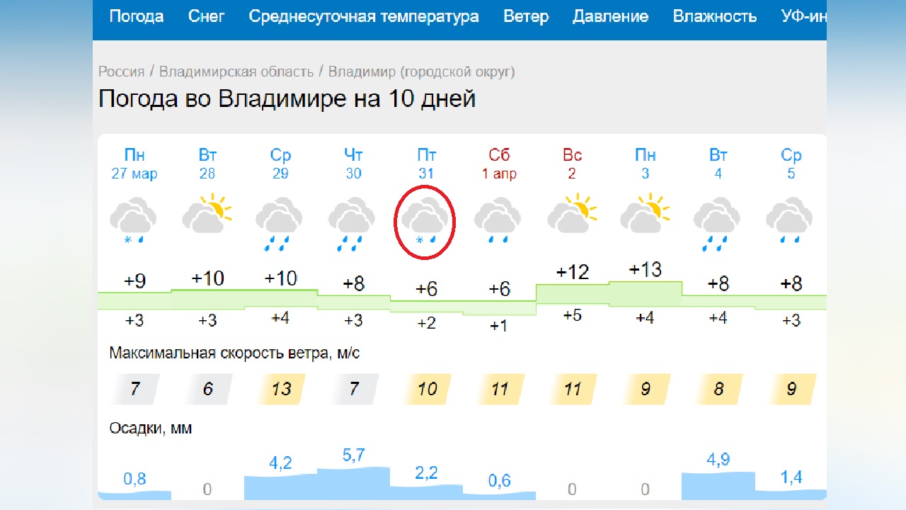 Похолодание и осадки в виде дождя со снегом ждут жителей Владимирской области в конце рабочей недели. Самыми холодными окажутся четверг и пятница, 30 и 31 марта, следует из прогнозов Gismeteo.ru и «ЯндексПогода».