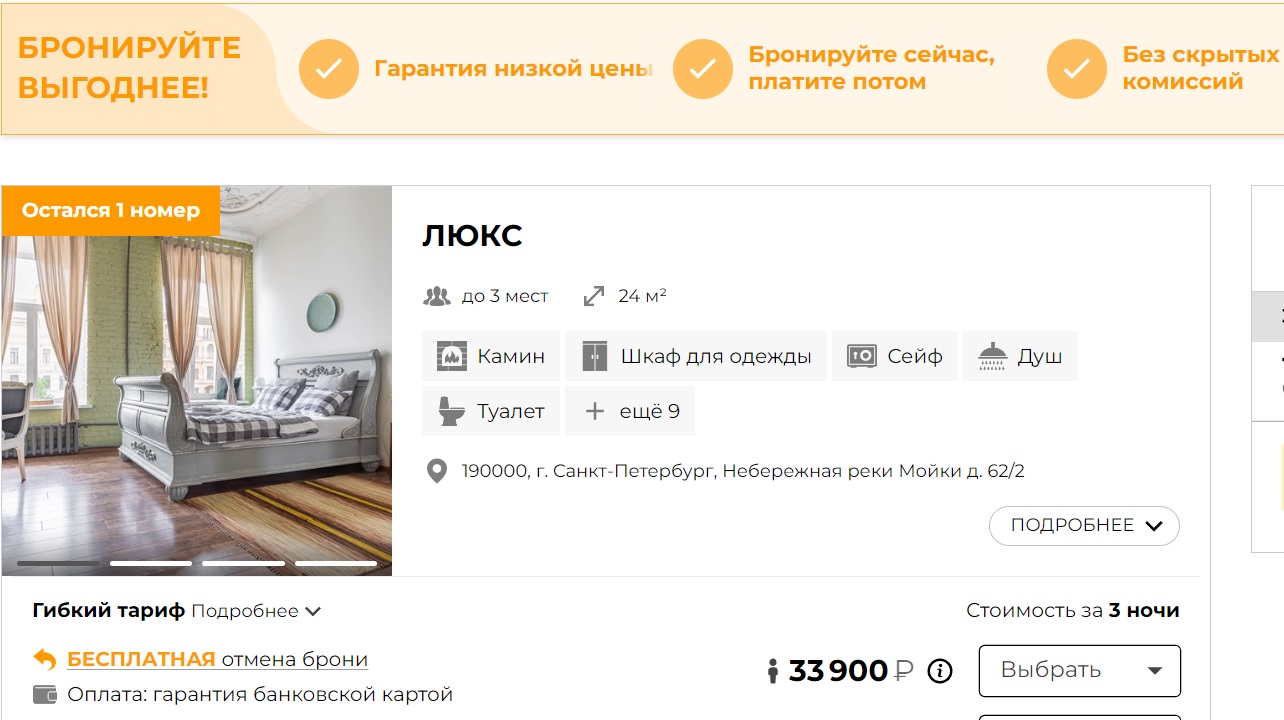 За комфорт и красивый вид нужно платить. Из ближайших доступных дат оказались три ночи с 1 по 4 июня. Люкс с камином, туалетом, сейфом на Набережной Мойки, 62/2 обойдется в 33,9 тыс. рублей.