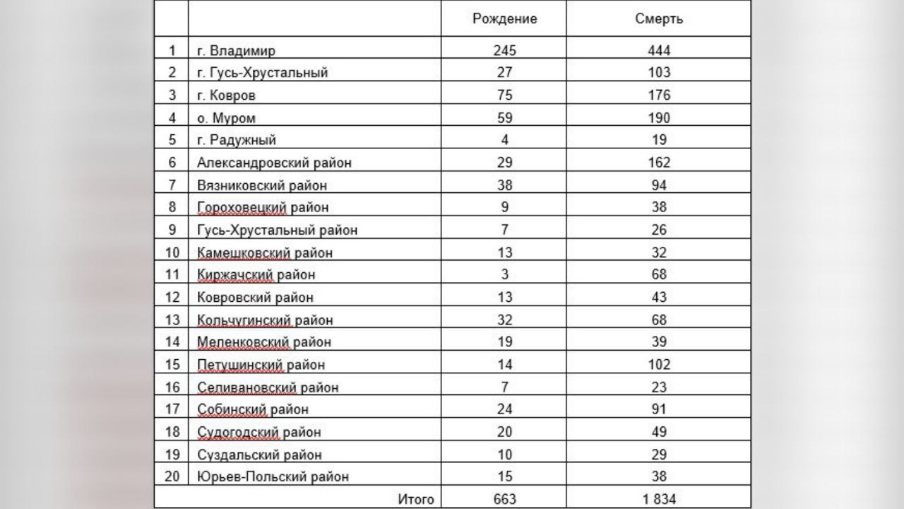Но по отношению смертности к рождаемости первое место занял Киржачский район. Смертность там превысила рождаемость более чем в 22 раза (три человека родились, 68 умерли). На втором месте расположился Петушинский район, здесь смертность выше рождаемости в семь раз (14 родились, 102 умерли). На третьем месте находится город Радужный – тут смертность превысила рождаемость в четыре раза (четыре родились, 19 умерли).