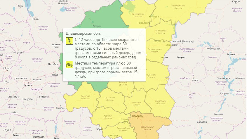 Синоптики объявили желтый уровень опасности во Владимирской области. Предупреждение действует до 19:00 субботы, 8 июля, сообщил Гидрометцентр России.
