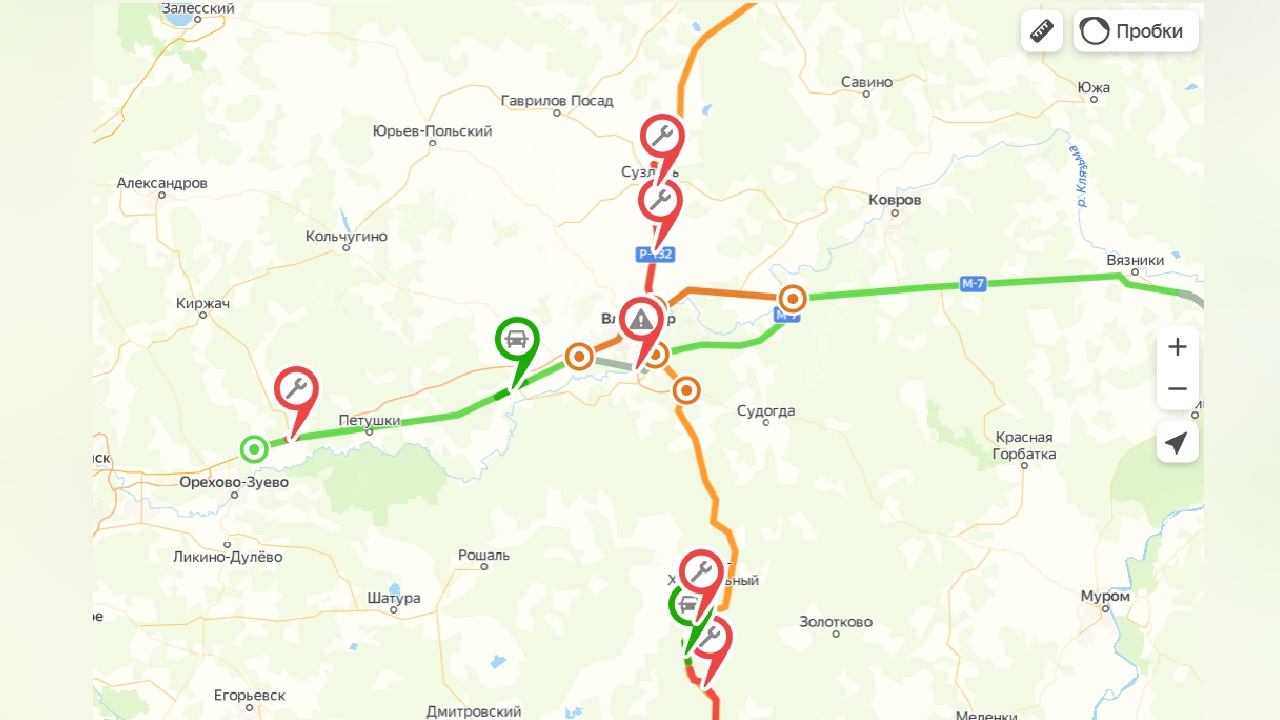 На М-7 на плановый ремонт закрыт участок в Покрове (км 101+500 – км 103+500). При этом движение идет по всем четырем полосам, ранее была закрыта одна. Максимальная скорость – 40 км/ч.