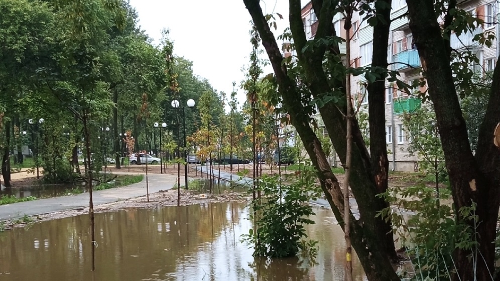 Ливни затопили сквер на улице Комсомольской. К счастью, луж на тротуарах не оказалось.
