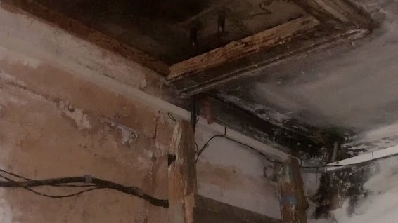 Фасад здания удерживает всего одна ржавая балка. Дом был возведен еще на царских сводах, которые рассыпаются на глазах. Собственники квартир изолируют его поролоном.