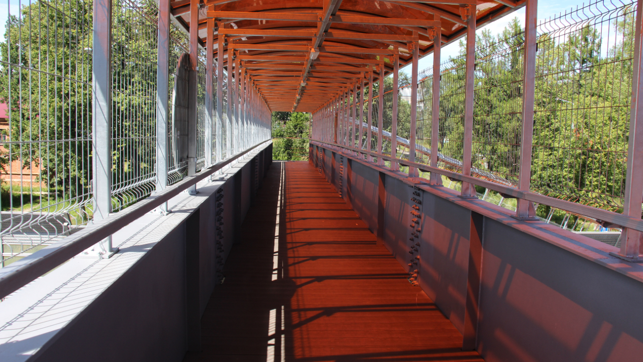 Переход оборудован стационарным освещением, видеонаблюдением и системой связи с диспетчером. От дождя и снега будет защищать светопрозрачное ограждение из монолитного поликарбоната.