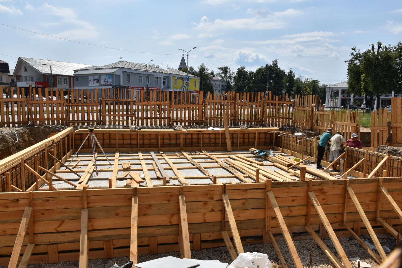 Подрядчик уже проложил все коммуникации. Сейчас идет бетонирование чаши сухого фонтана. На этой уйдет около двух недель. После подрядчик начнет благоустройство территории.