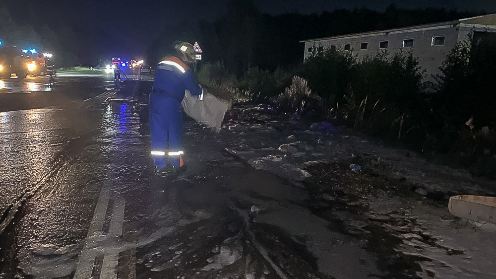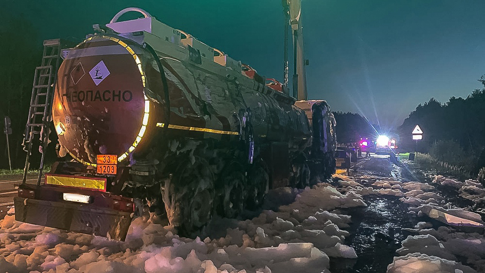 Одна из цистерн разгерметизировалась, и бензин вылился на почву. Сотрудники МЧС России залили дорогу пенообразователем, чтобы не произошло пожара или взрыва.