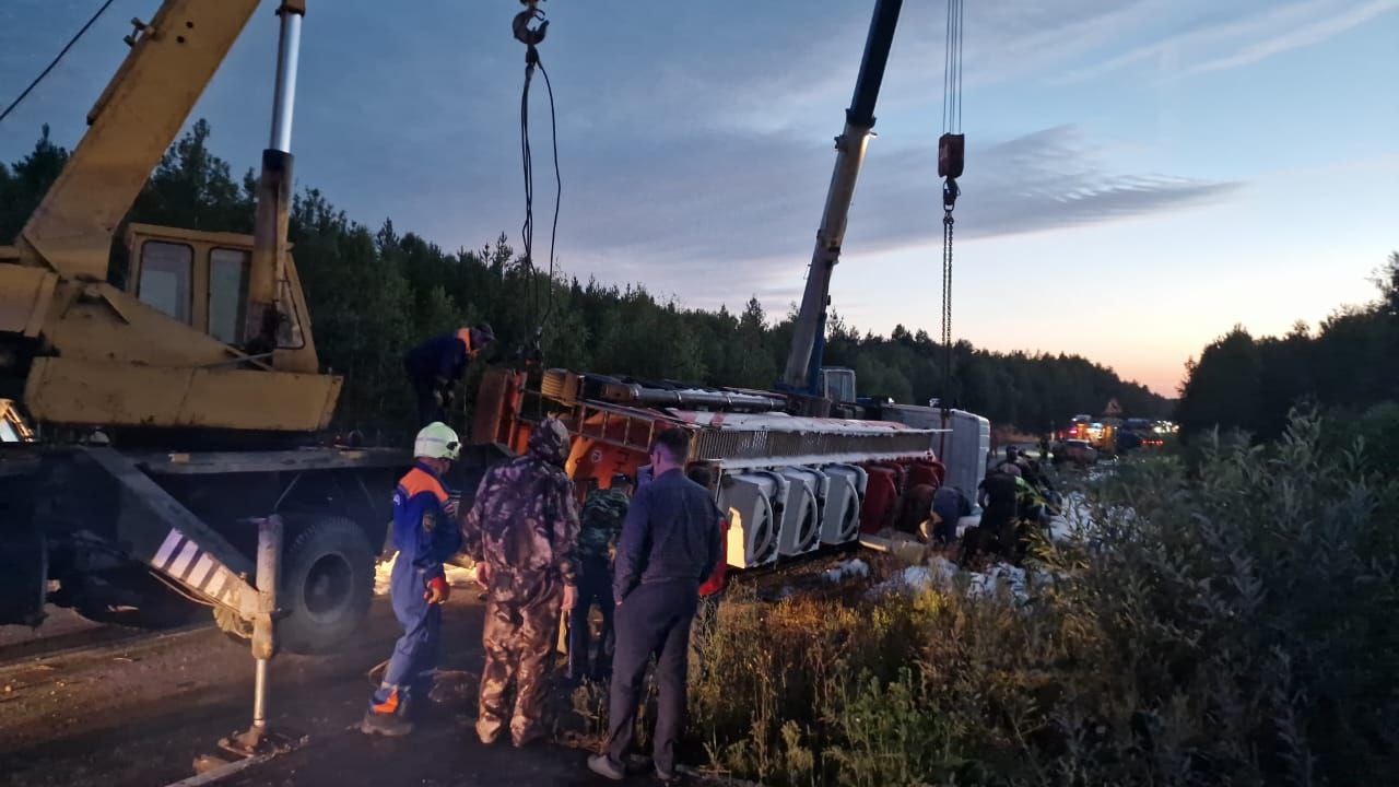 Уже поздним вечером экстренные службы с помощью грузоподъемного крана перевернули бензовоз.