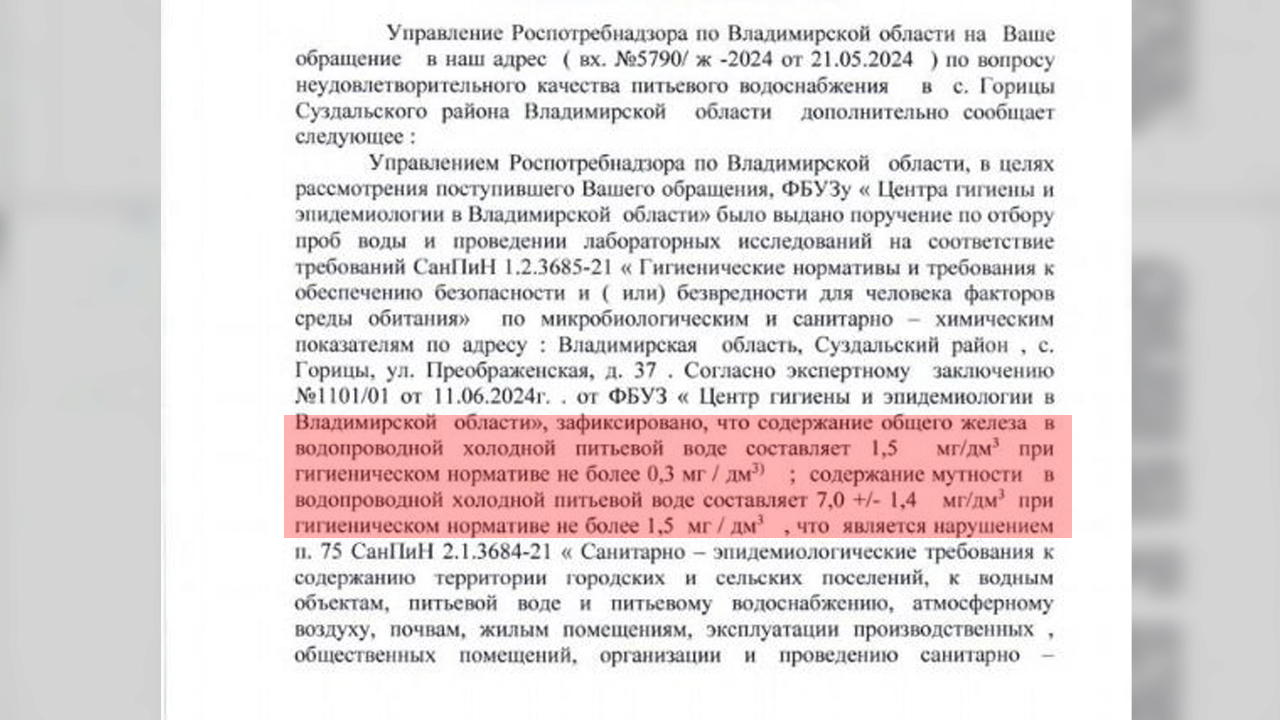 Жители взяли пробу воды и отправили в Роспотребнадзор. Результаты показали, что содержание железа превышает норму в пять раз, а показатель мутность выше в 4,5 раза. Все это является нарушением норм СанПиНа.