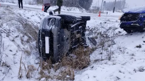 По предварительным данным, все случилось в 15:10 на 255 км дороги. 49-летняя водитель серого «китайца» не уступила дорогу иномарке синего цвета под управлением 65-летнего автомобилиста. От удара первое авто вылетело с дороги и перевернулось.