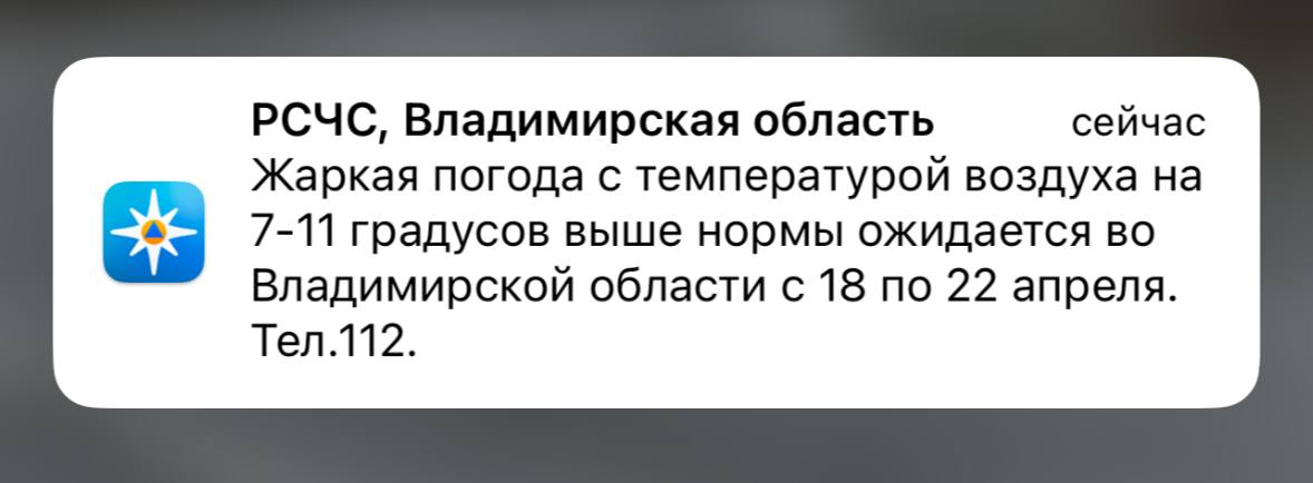 Аномальная для апреля жара придет во Владимирскую область в пятницу, 18 апреля. Такая погода продержится до вторника, 22 апреля, включительно. Информацию об этом распространило МЧС.