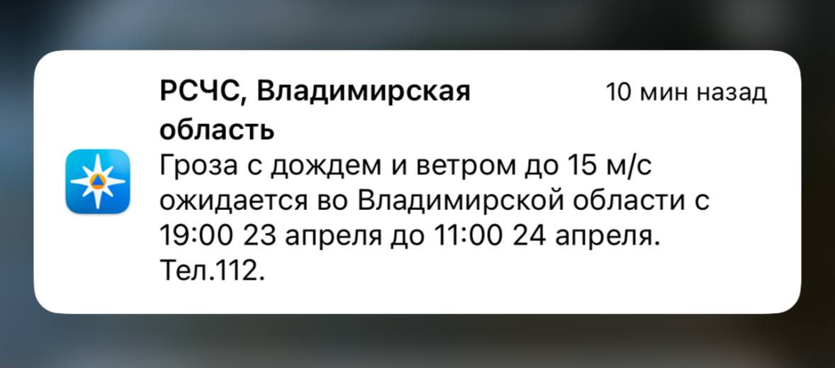 Гроза с дождем и ветром до 15 м/с ожидается во Владимирской области с 19:00 среды, 23 апреля, и до 11:00 четверга, 24 апреля. Это следует из экстренного предупреждения МЧС.