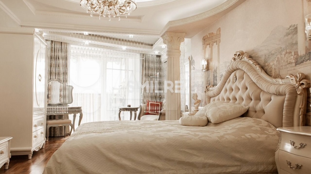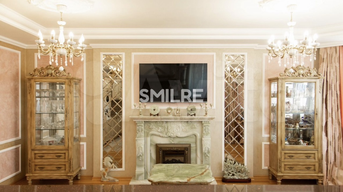 Ремонт в жилье площадью 153,1 кв. м. – по-настоящему королевский. Среди предметов интерьера – камин, колонны, а также винтажная мебель.