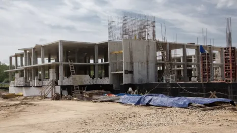 Подрядчик планирует к зиме построить все этажи, крышу, стены, вставить окна. В 2026 году ой займется внутренними работами.