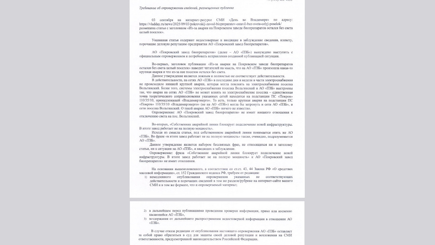 Покровский завод биопрепаратов отрицает причастность к аварии на кабельной линии, из-за которой поселок Вольгинский в Петушинском районе остался без света. Исполнительный директор АО «ПЗБ» Андрей Лодыгин направил редакции «День во Владимире» письмо, в котором потребовал опровергнуть новость, опубликованную в среду, 3 сентября.