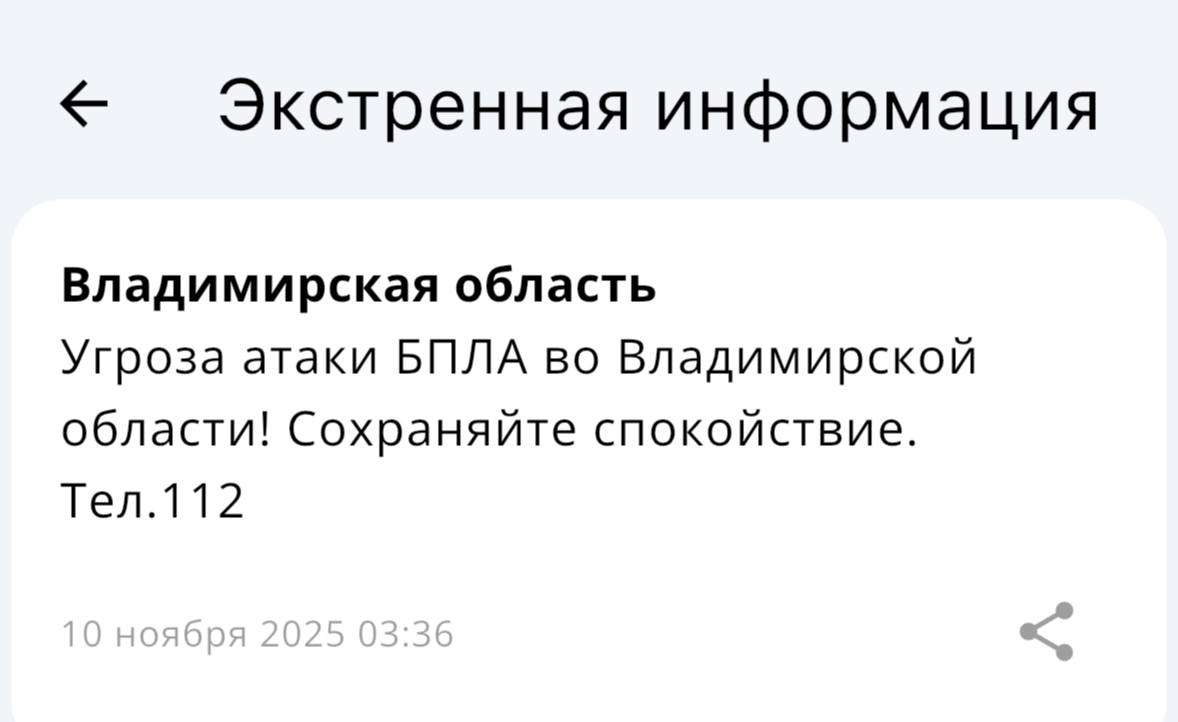 Угрозу атаки БПЛА объявили во Владимирской области в 3:36 в понедельник, 10 ноября. Экстренное предупреждение пришло через приложение МЧС России.