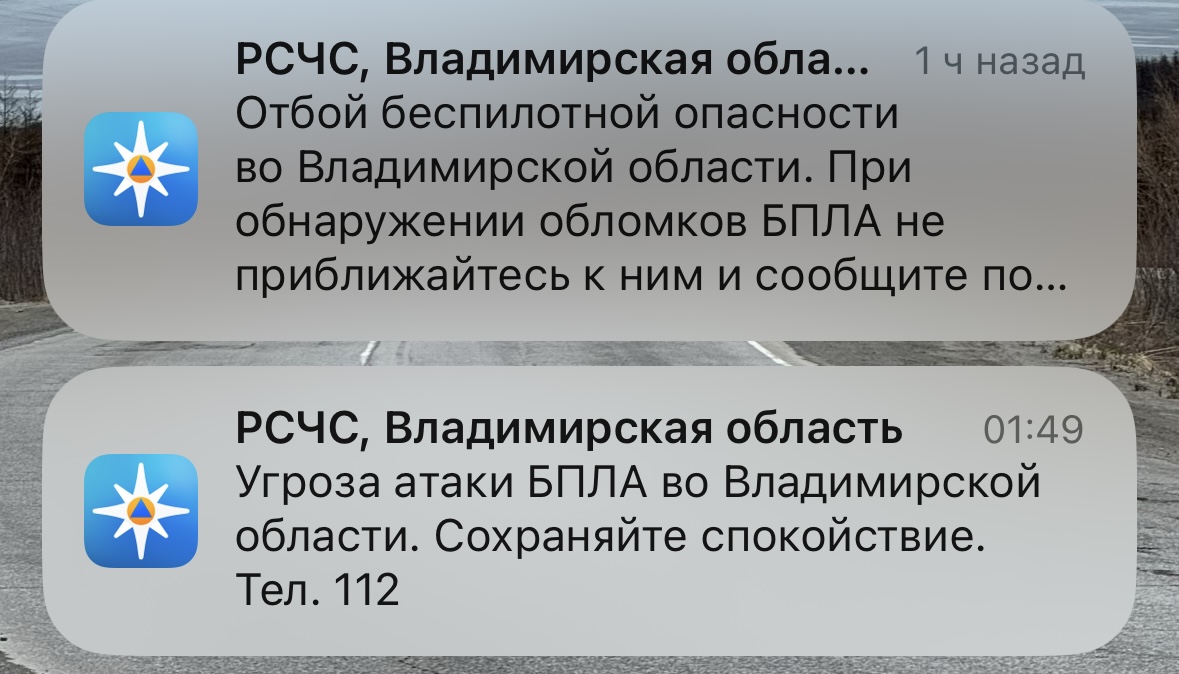 Угрозу атаки БПЛА объявили во Владимирской области в 1:49 в воскресенье, 16 ноября. Оповещение пришло через приложение МЧС России.