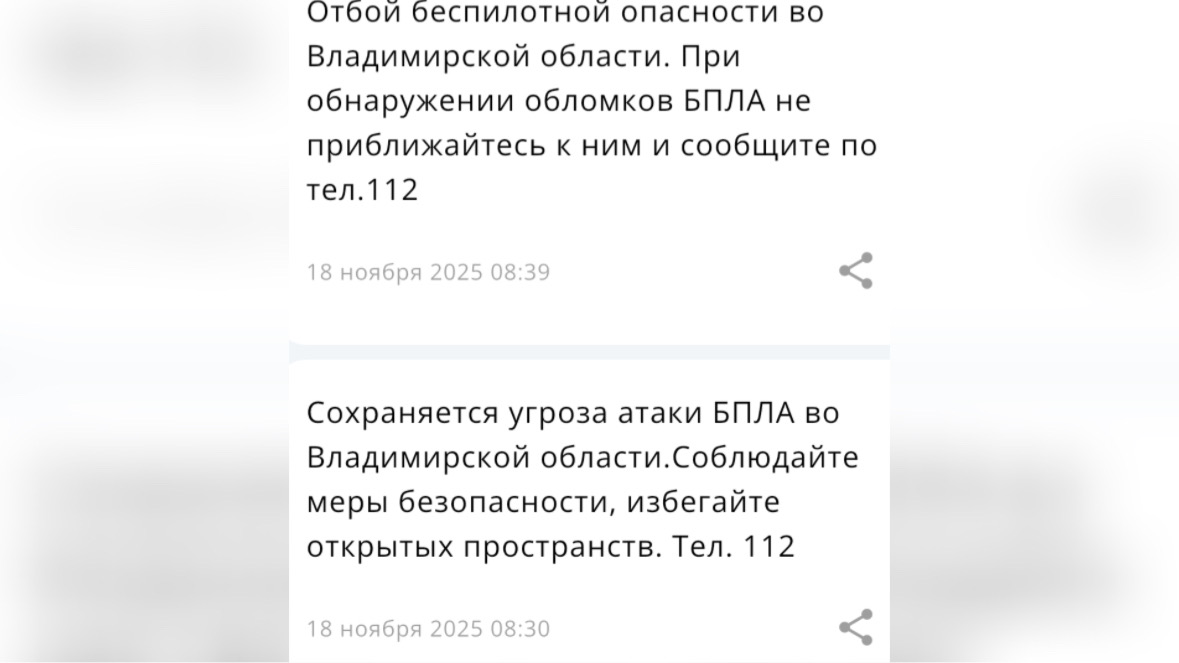 Угрозу атаки БПЛА объявили во Владимирской области в 01:54 вторника, 18 ноября. Оповещение пришло через приложение МЧС России.