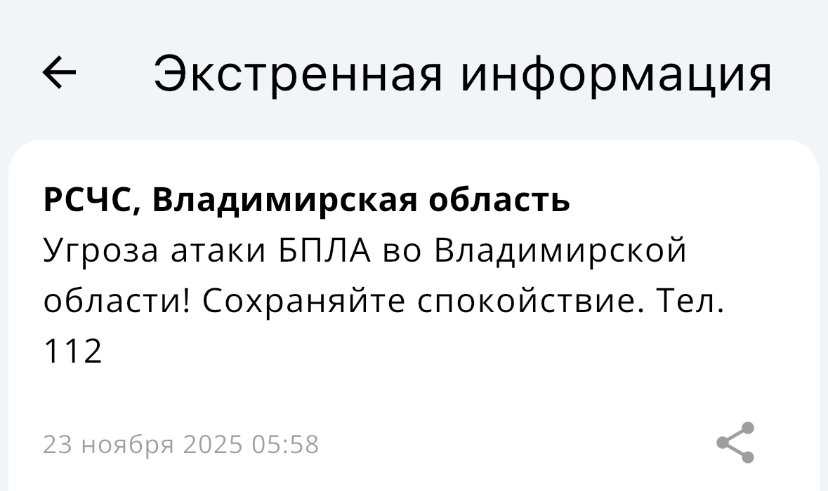 Угрозу атаки БПЛА объявили во Владимирской области в 5:58 в воскресенье, 23 ноября. Оповещение пришло через приложение МЧС России.