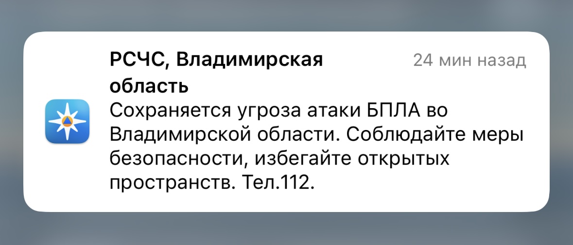 Угроза атаки БПЛА продолжает действовать во Владимирской области утром субботы, 6 декабря. Это следует из предупреждения МЧС России, которое прислали в 8:37.