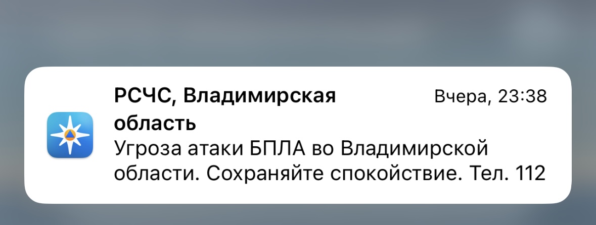 Угрозу атаки БПЛА объявили во Владимирской области в 23:38 пятницы, 5 декабря. Оповещение пришло через приложение МЧС России.