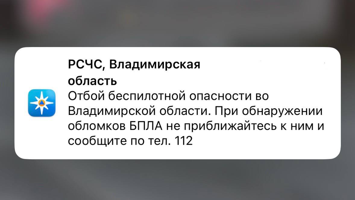 Отбой беспилотной опасности объявили во Владимирской области в 13:00 в воскресенье, 7 декабря. Сообщение об этом пришло в официальном приложении МЧС России.