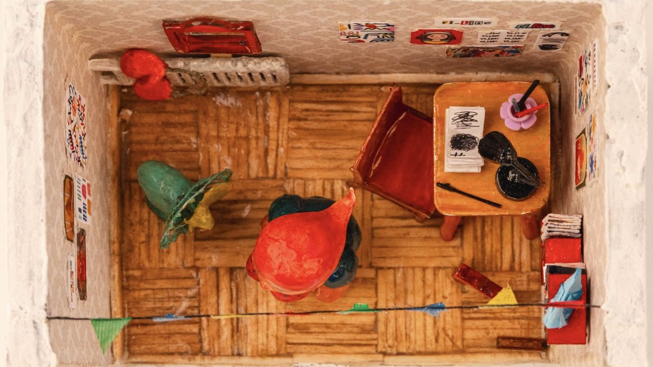 В центре миниатюры – типовая комната с обоями, радиатором и паркетом. Девочка отдыхает после первых попыток сделать зарисовки на бумаге.