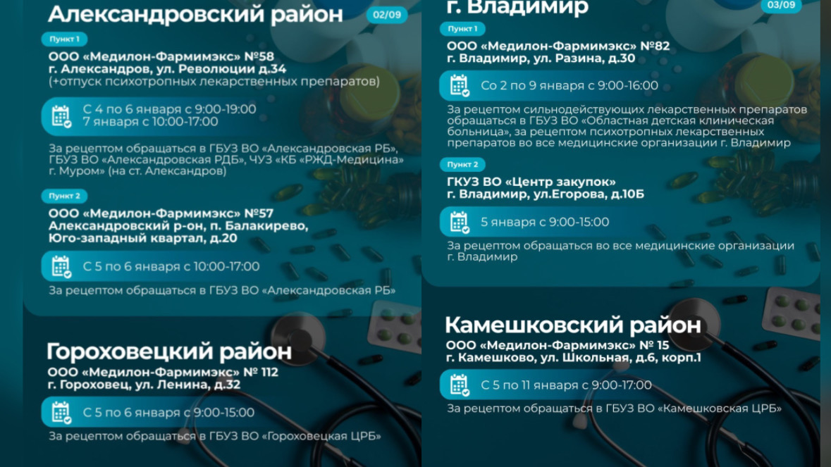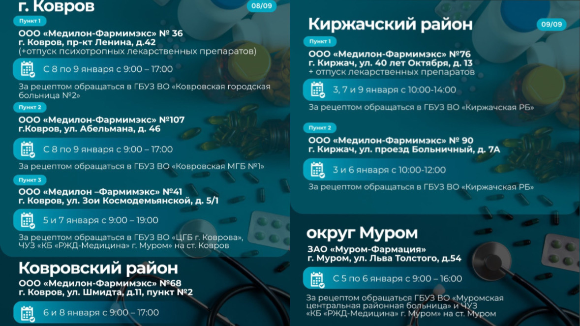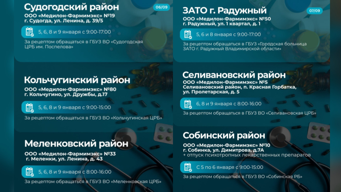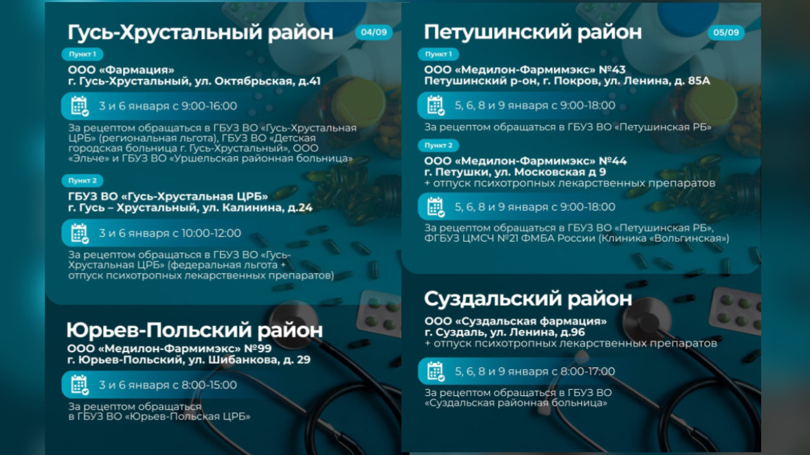 Аптеки Владимирской области продолжат обеспечивать льготников лекарствами в новогодние каникулы. График работы опубликовала пресс-служба правительства региона в четверг, 25 декабря.