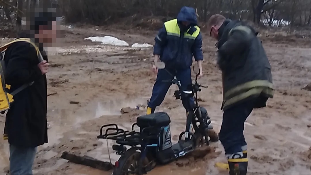 Попытки вынуть электровелосипед самостоятельно не увенчались успехом – продолжало засасывать все больше и больше. В итоге горе-доставщика пришлось откапывать спасателям.